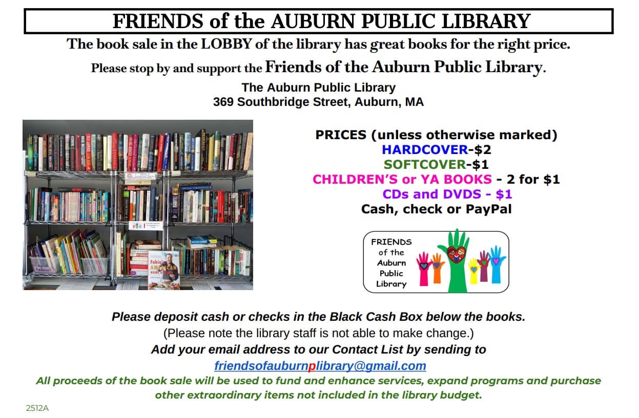 The Friends offers books for sale in the lobby of the Auburn Public Library. Prices are posted in the lobby. Also, the Friends holds a BIG Book Sale at the Library several times a year. Look for our flyers, and postings in the Lobby, on our Facebook group page and on the Library website under Friends for dates and times.